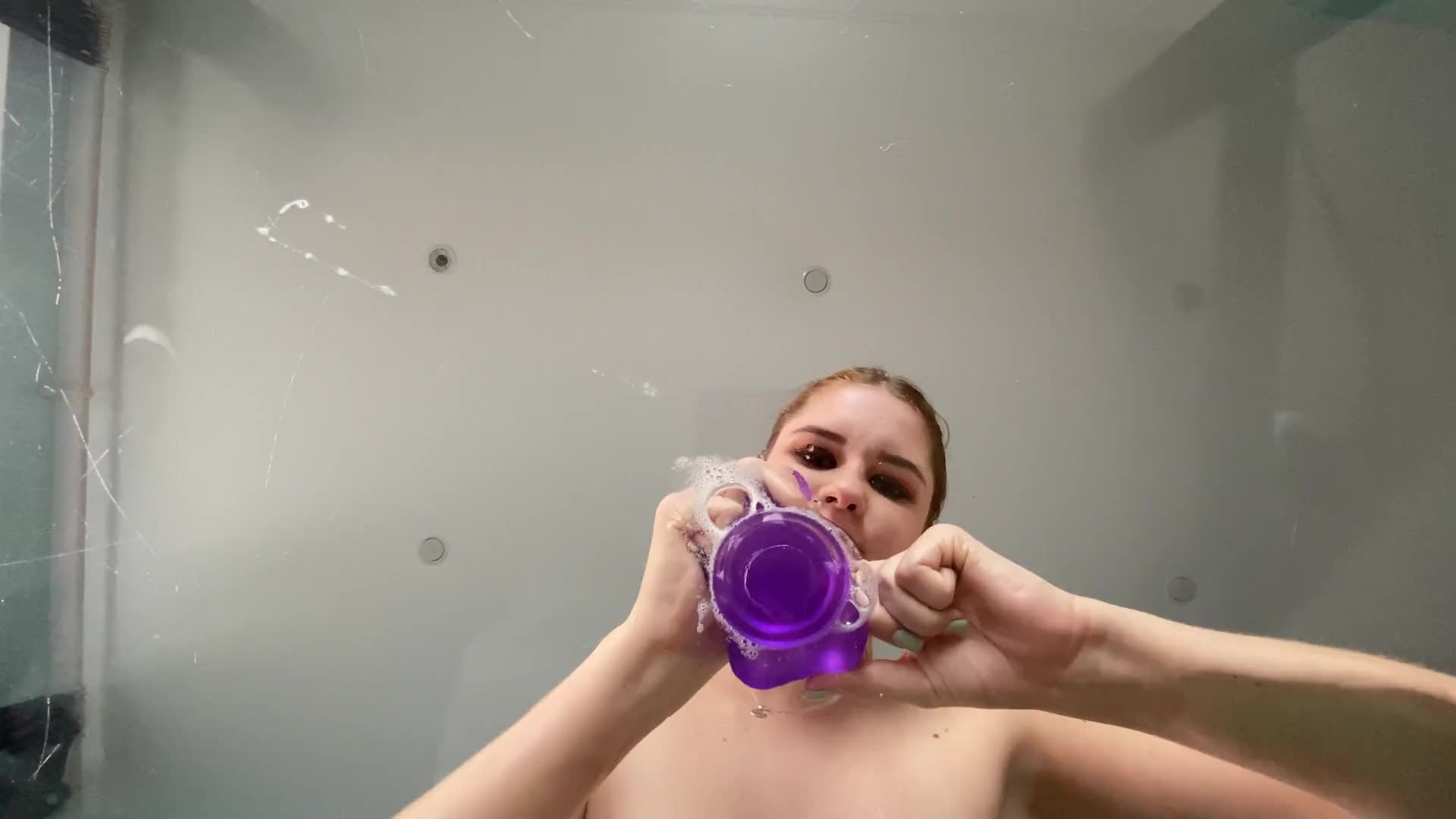 the baby does a very dirty blowjob on a transparent table, licks her drool and rubs her tits on the